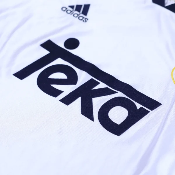 The jersey is characterized by its minimalist aesthetic, with clean lines and a lack of complex patterns, emphasizing the club’s classic style. The collar is typically a classic polo style, adding elegance to the overall look. The Adidas logo is prominently displayed on the right chest, while the Real Madrid crest is positioned on the left, showcasing the team’s pride. The sponsor’s logo, Teka, is centrally placed, which was common practice during this era.