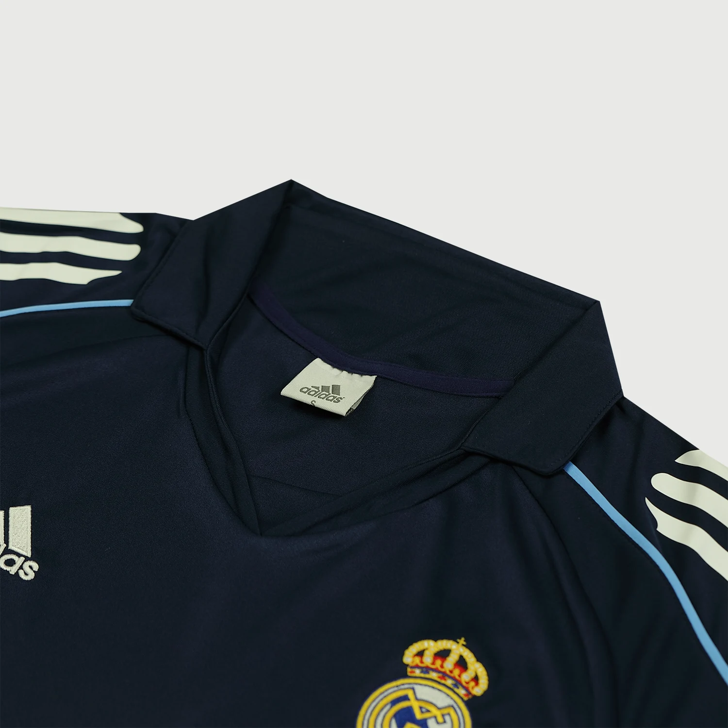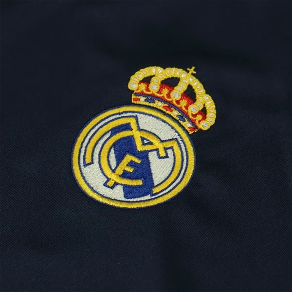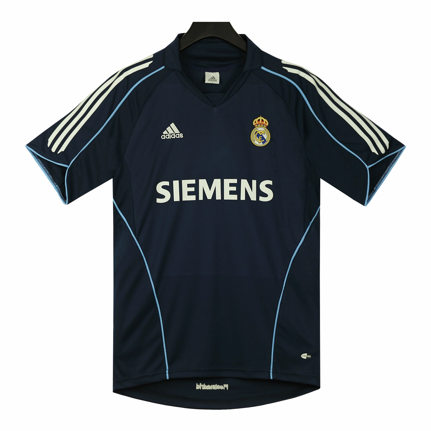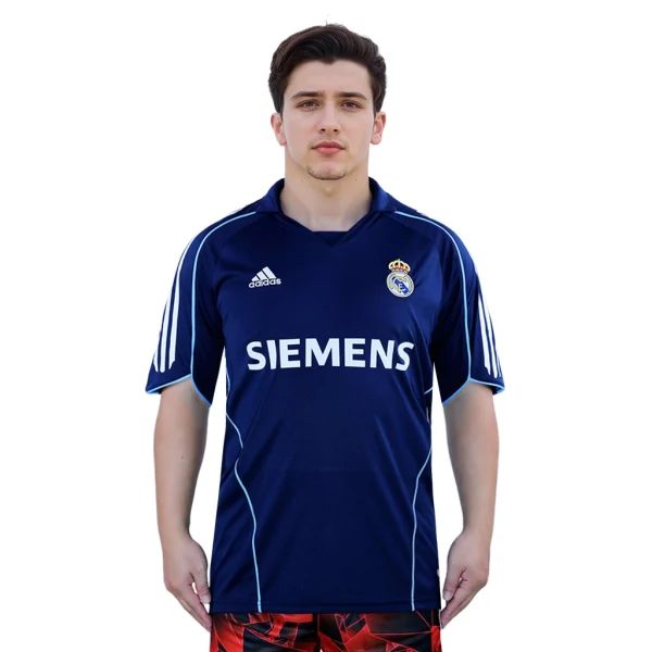 The Real Madrid 2005-06 away shirt is navy blue, It features embroidered brand logos and a sewn-on team badge, maintaining a classic and durable look.