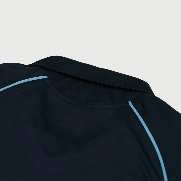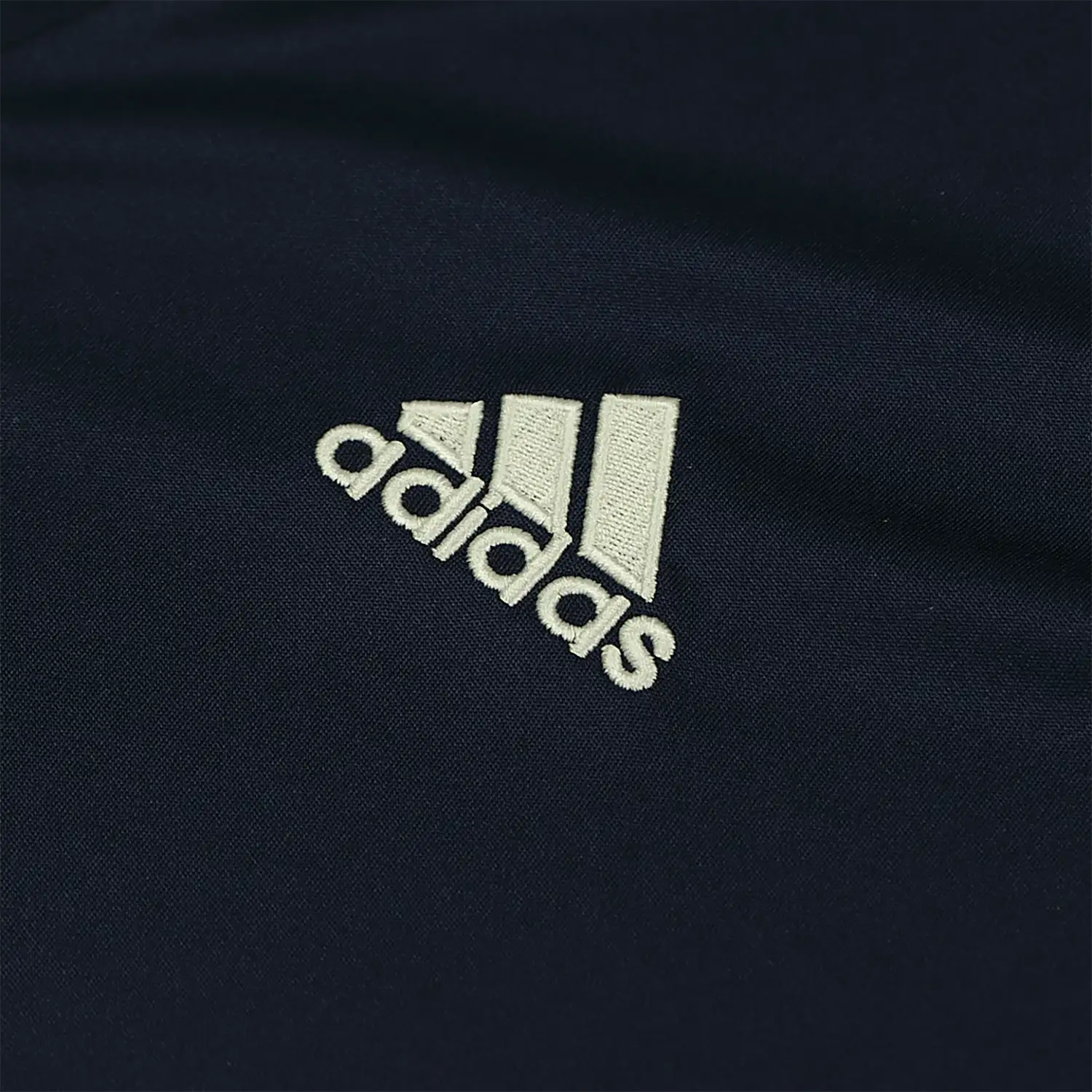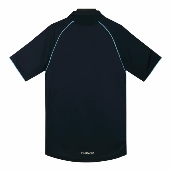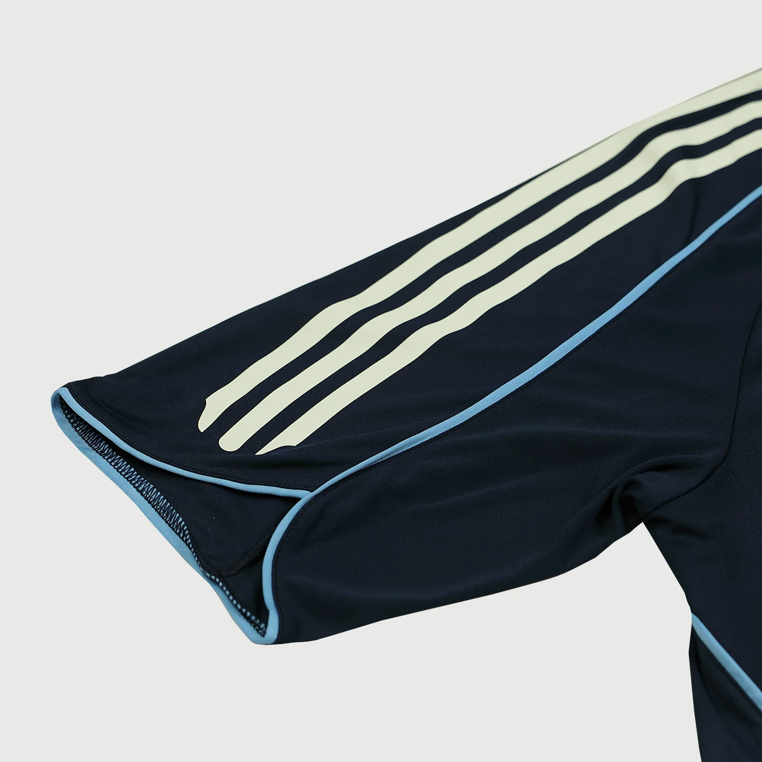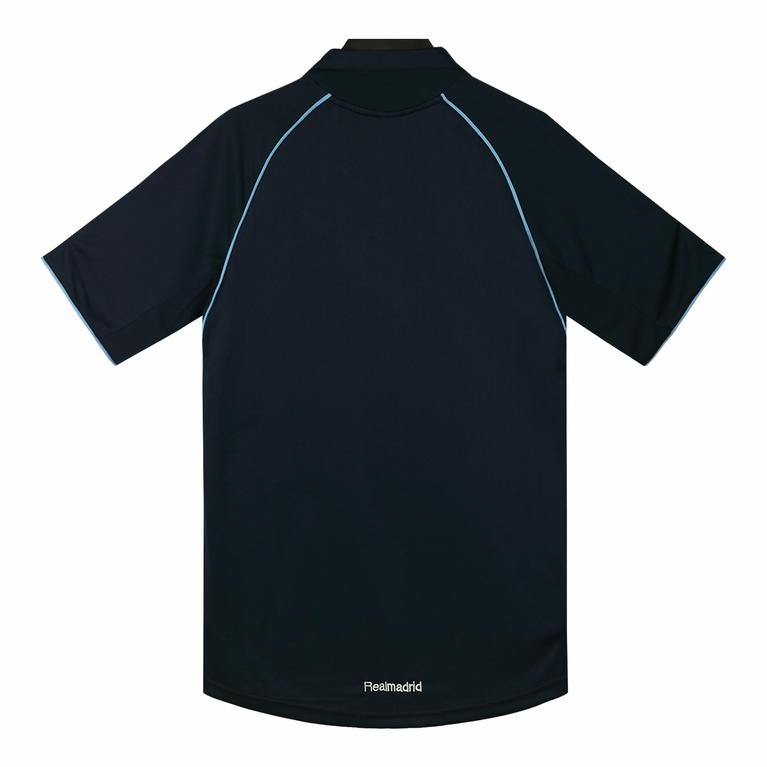 The Real Madrid 2005-06 away shirt is navy blue, It features embroidered brand logos and a sewn-on team badge, maintaining a classic and durable look.