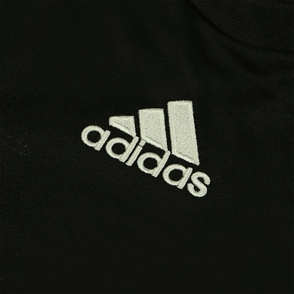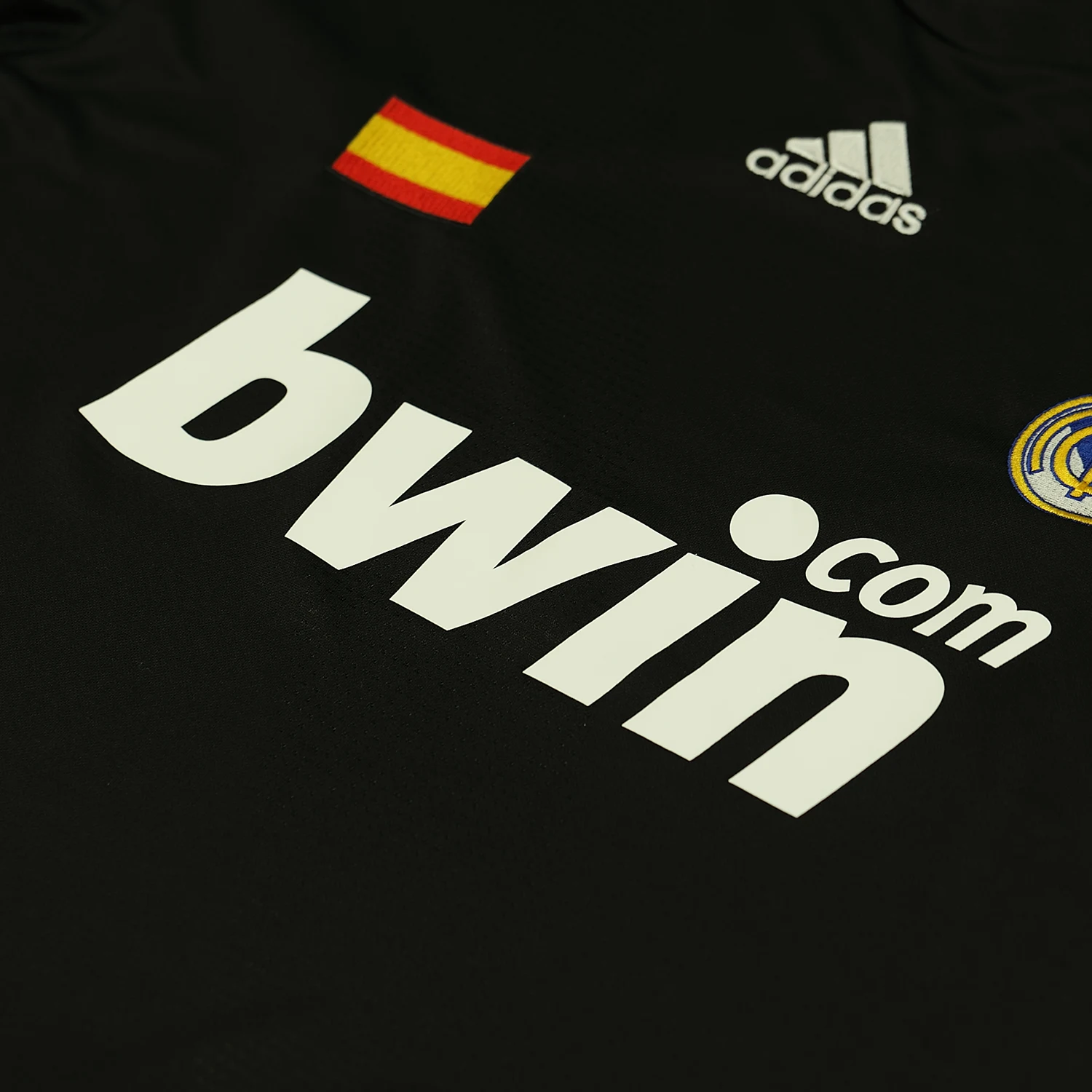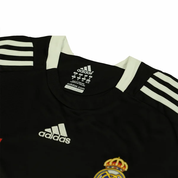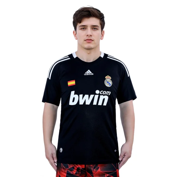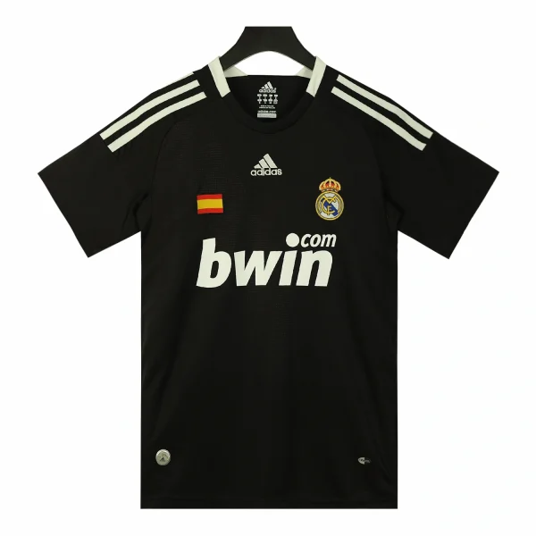 The Real Madrid 2008-09 third shirt is a notable piece of football apparel, characterized by its classic all-black design with white accents. This shirt was produced by Adidas and was used during the 2008-09 La Liga season, reflecting a return to a simpler aesthetic reminiscent of earlier designs from the club’s history.