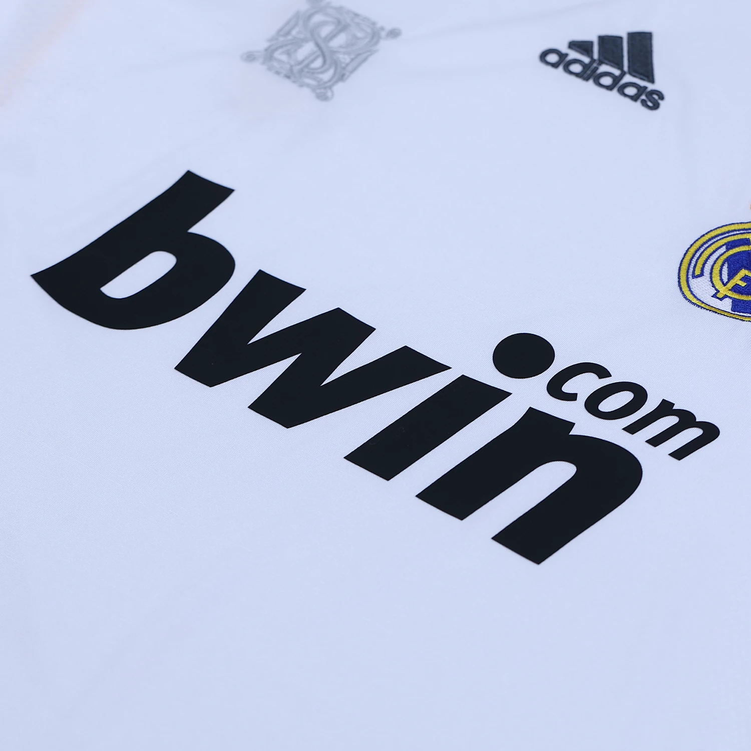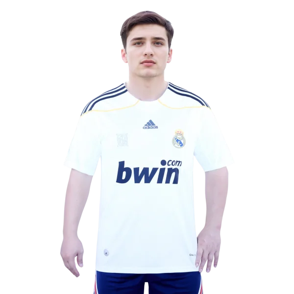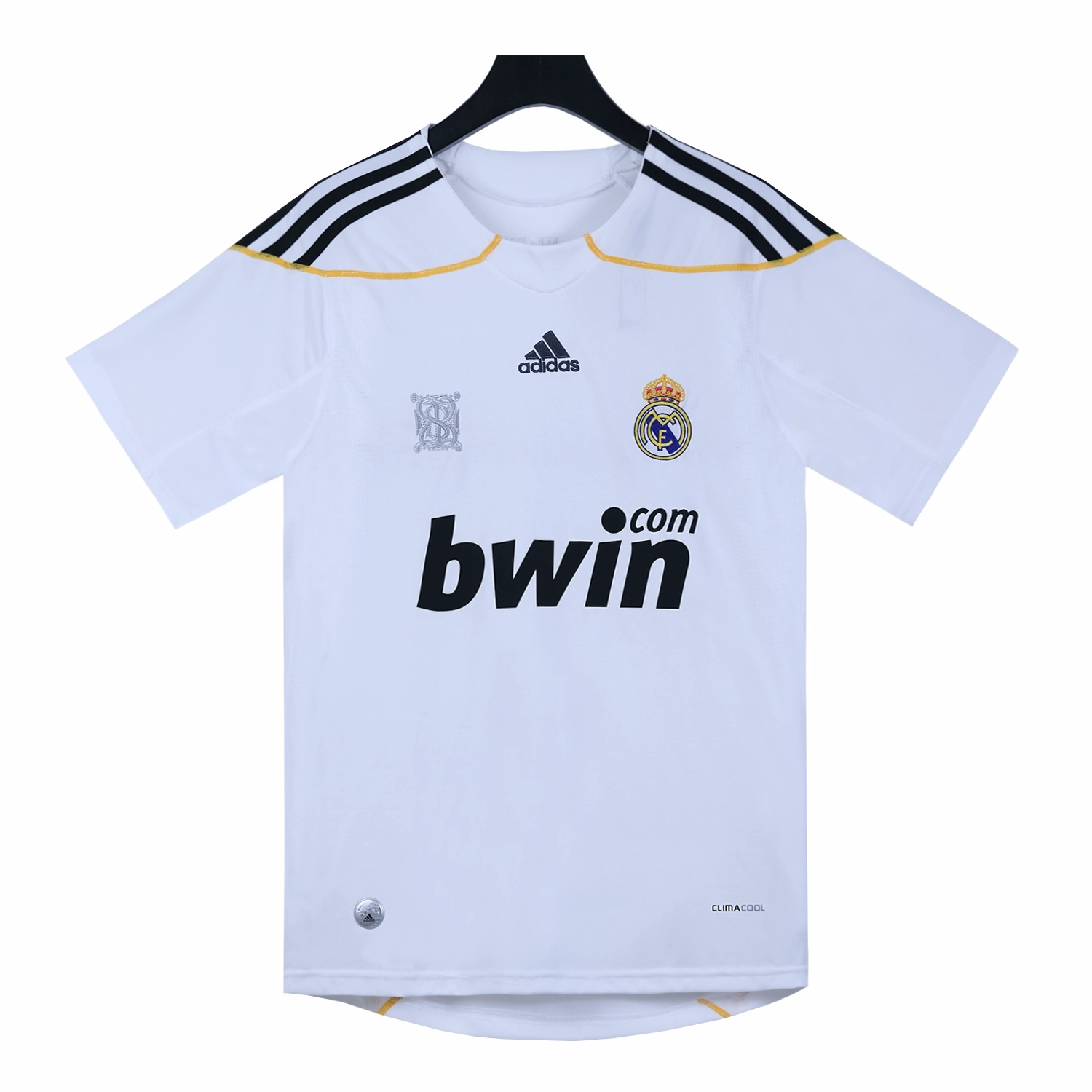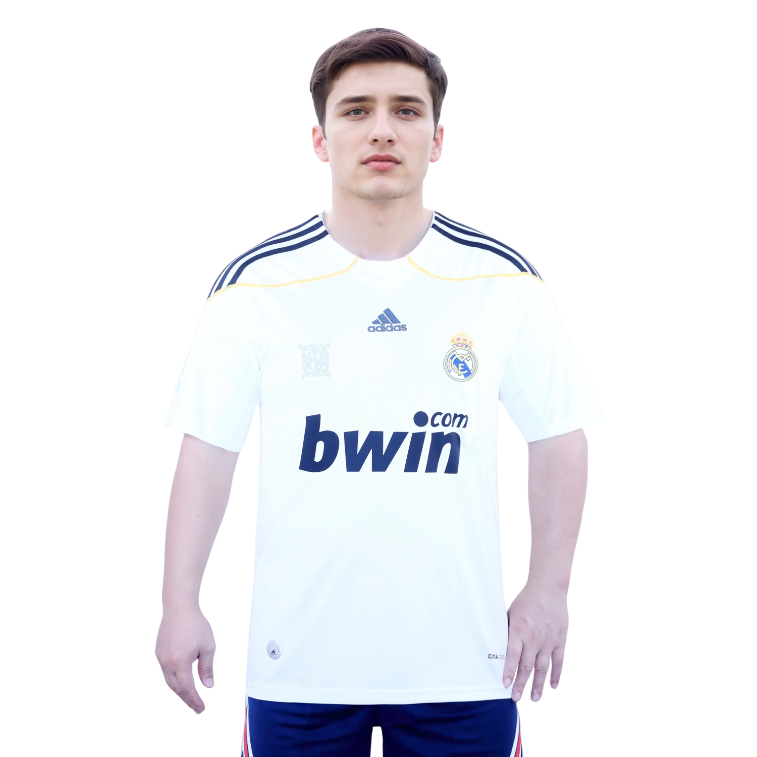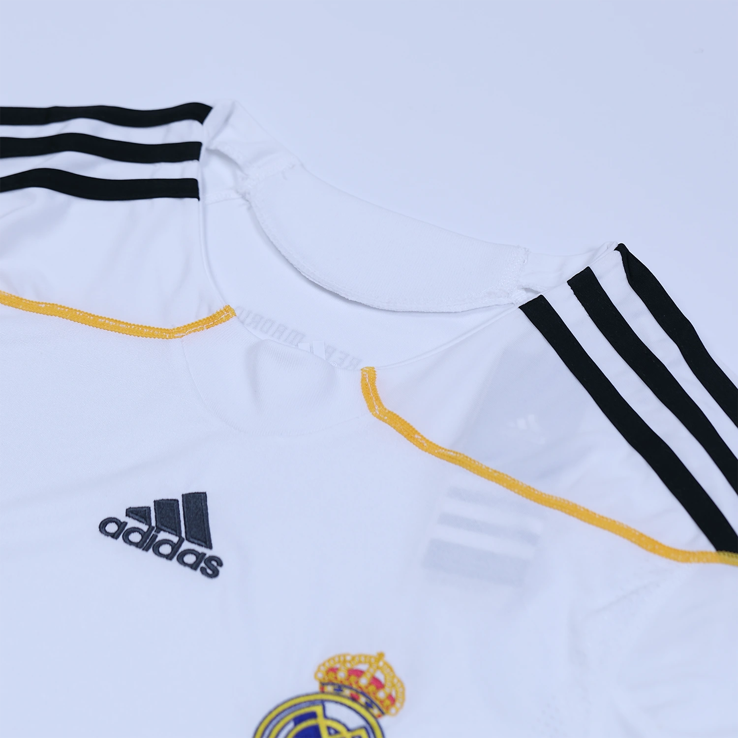 The Real Madrid 2009-10 home shirt is a blend of traditional and modern design elements, The primary color of the shirt is white, a longstanding tradition for Real Madrid, symbolizing purity and excellence. This classic white base is complemented by gold accents, adding a touch of elegance and distinction to the overall design.
