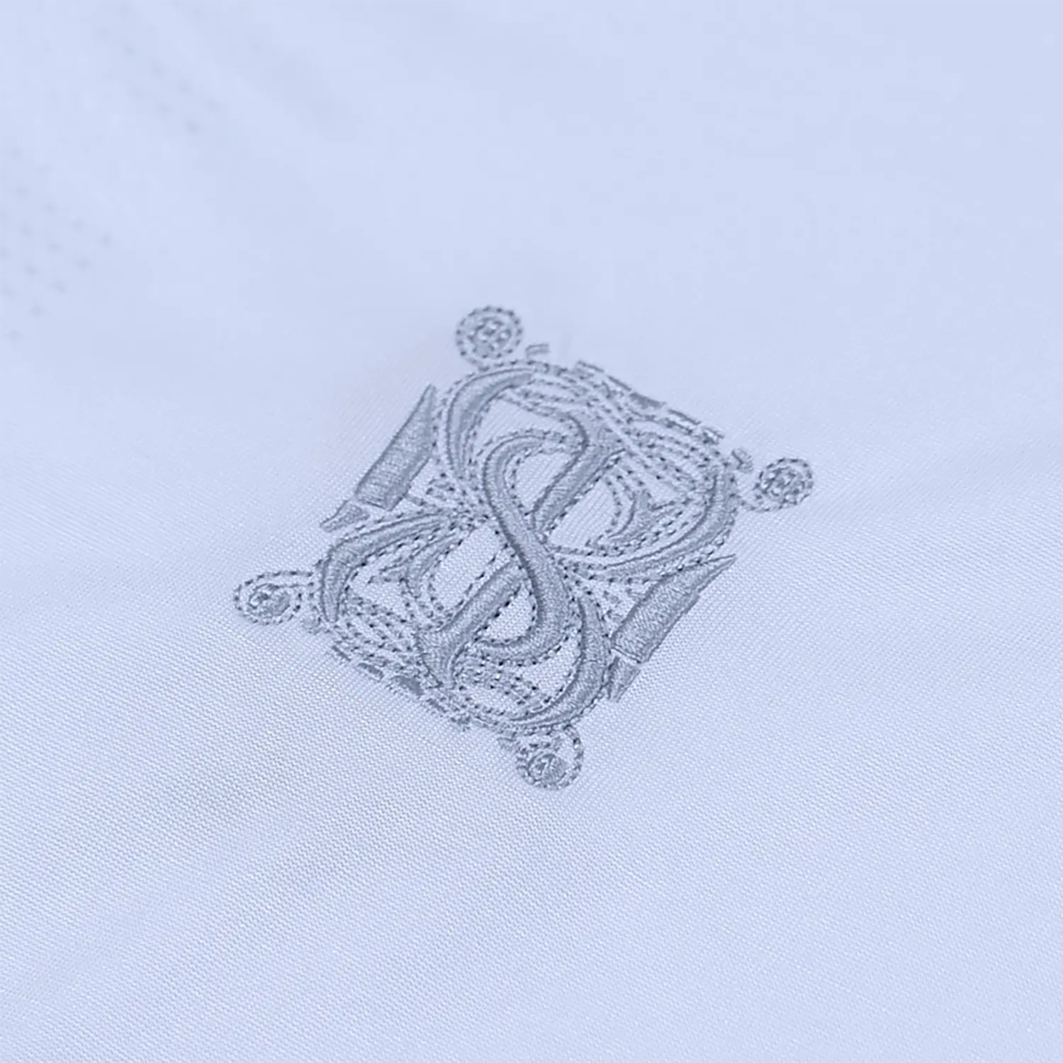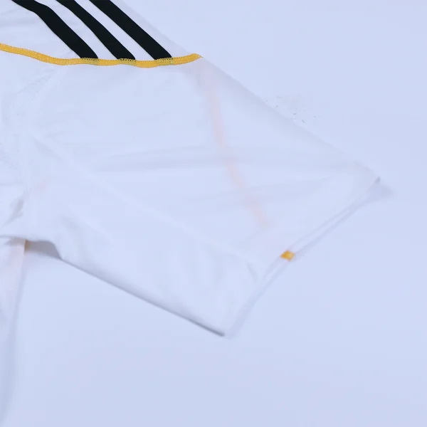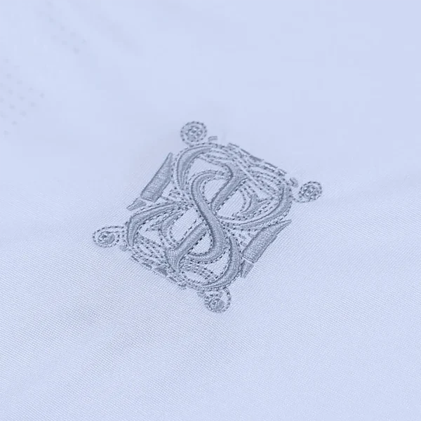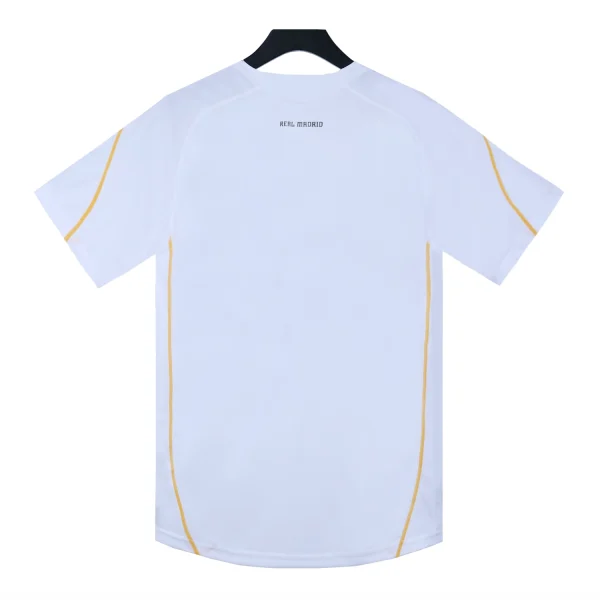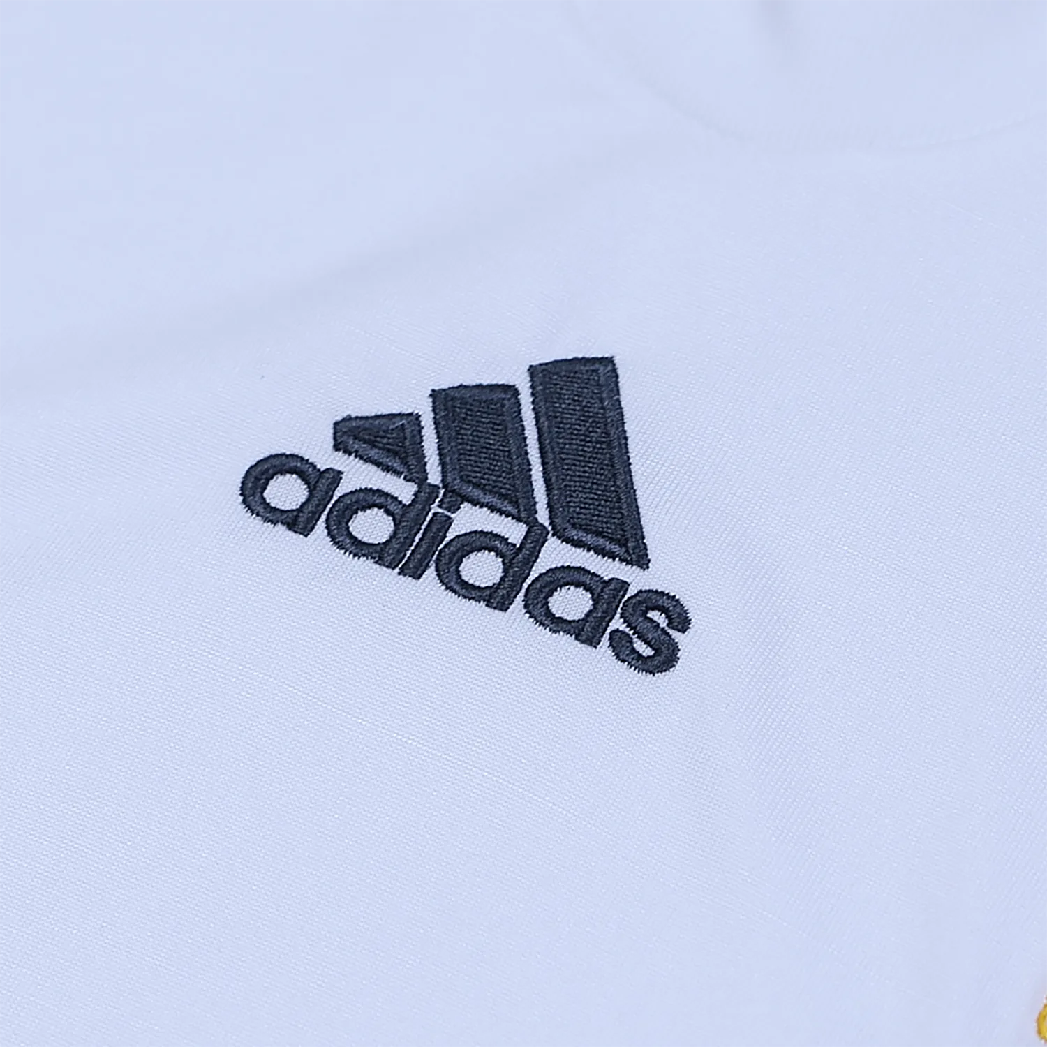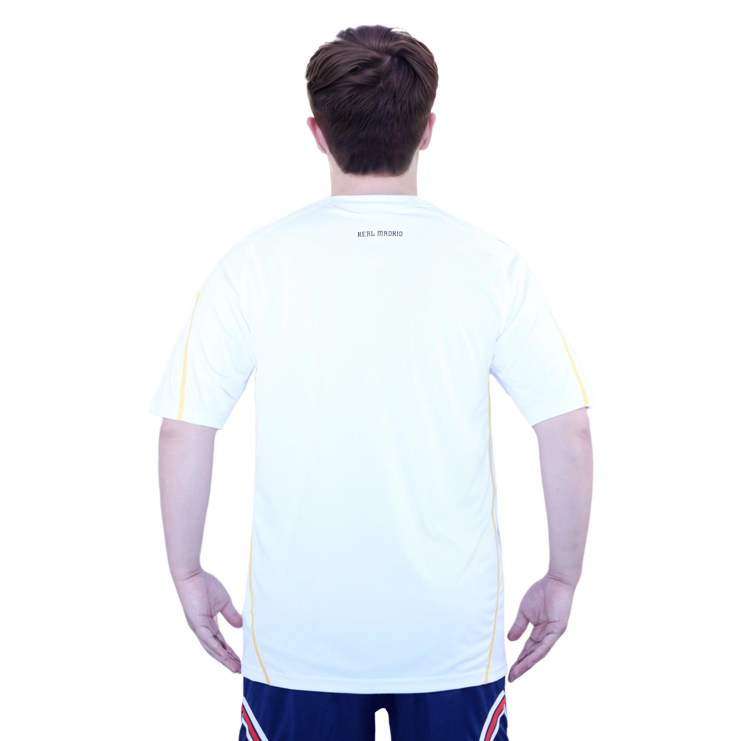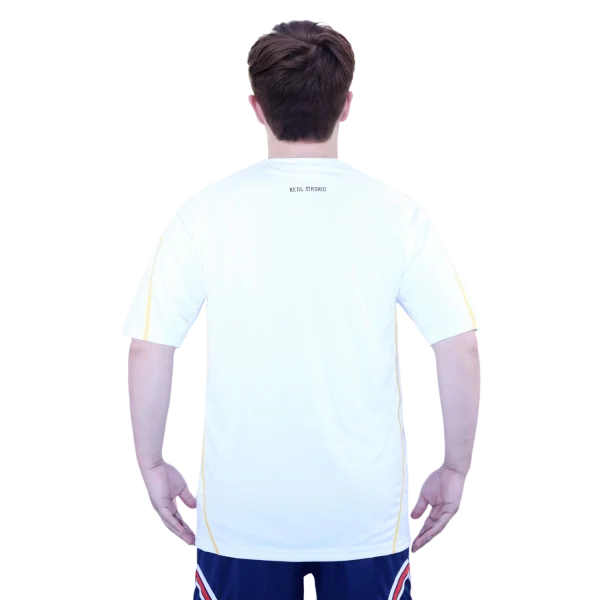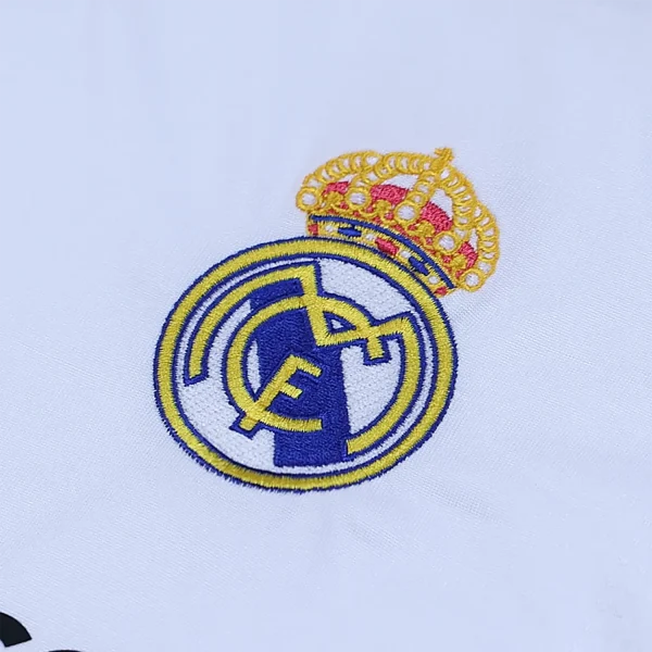 The Real Madrid 2009-10 home shirt is a blend of traditional and modern design elements, The primary color of the shirt is white, a longstanding tradition for Real Madrid, symbolizing purity and excellence. This classic white base is complemented by gold accents, adding a touch of elegance and distinction to the overall design.