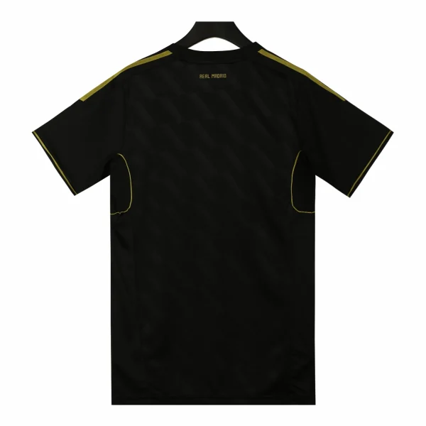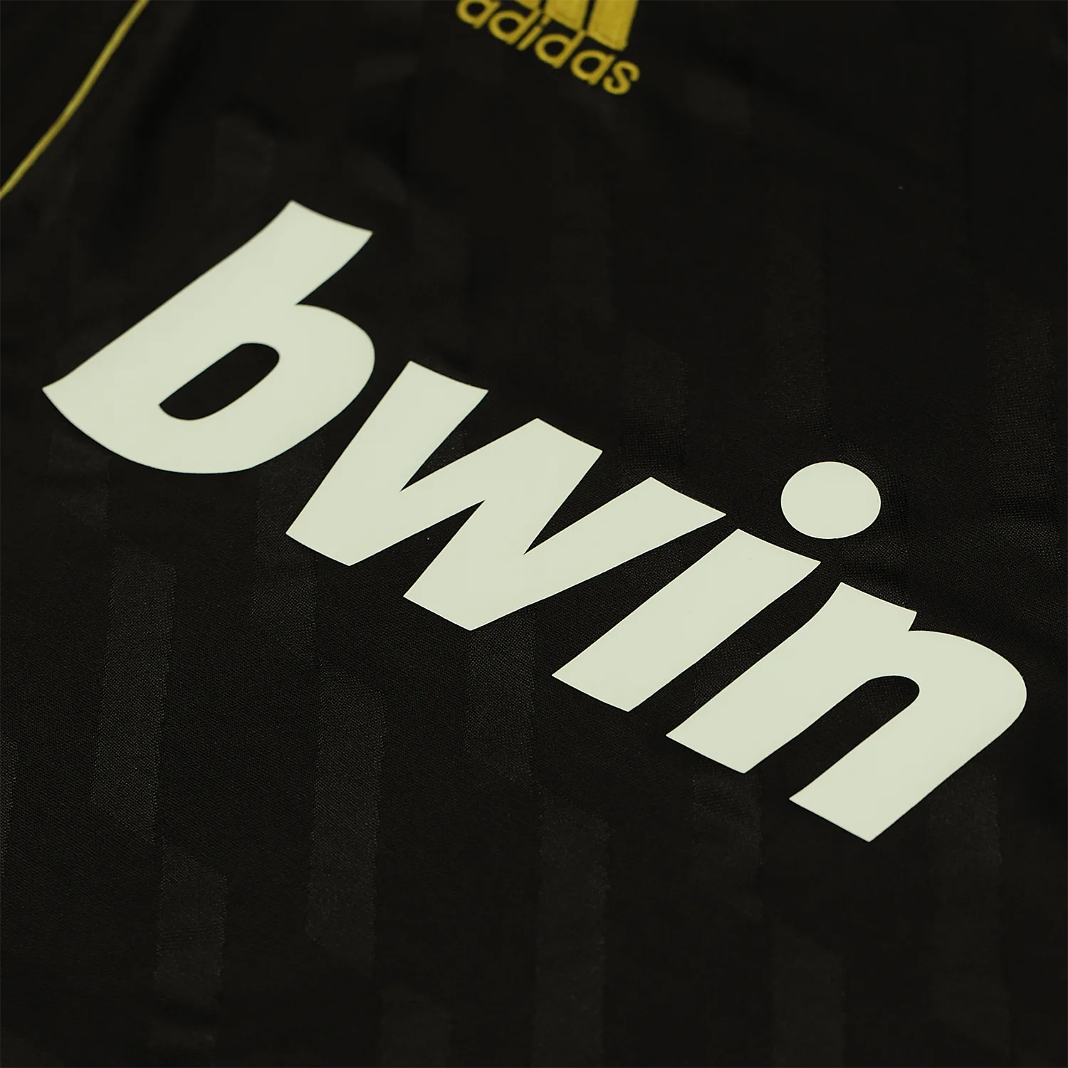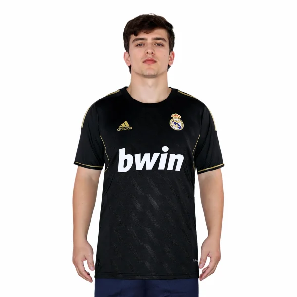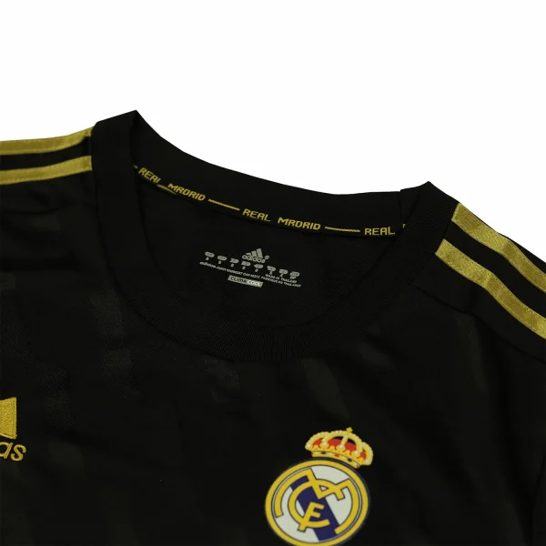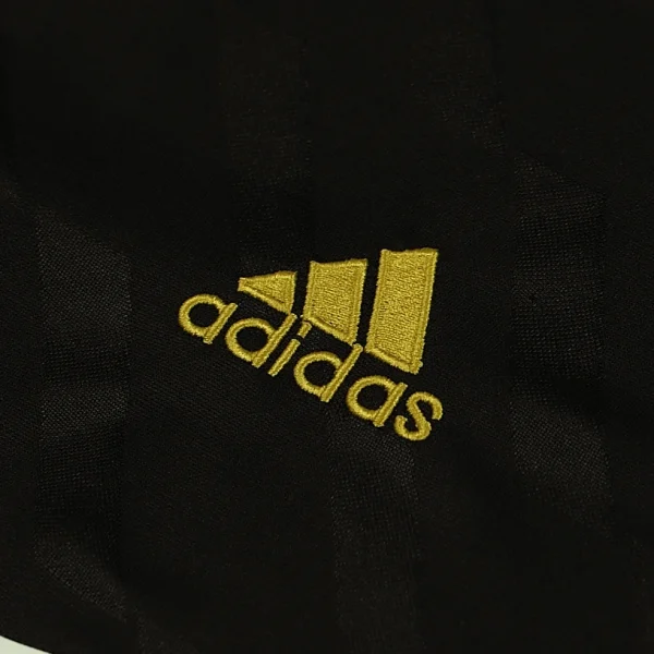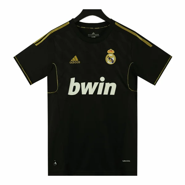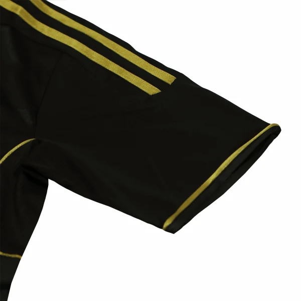 The Real Madrid 2011-12 away shirt is a striking piece of football apparel that reflects the club’s prestigious heritage and modern design sensibilities. Manufactured by Adidas, this shirt features a predominantly black color scheme with gold detailing, which was described as ‘gold fever’ by the brand, although it appears more bronze in certain lights. This design choice aligns with the trend of using darker colors for away kits, making it visually distinct and stylish for players and fans alike.