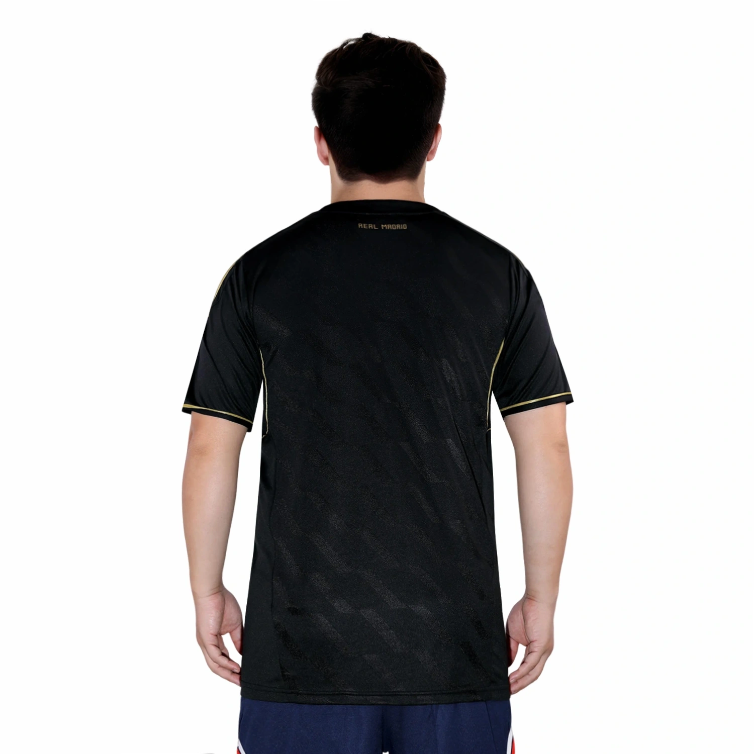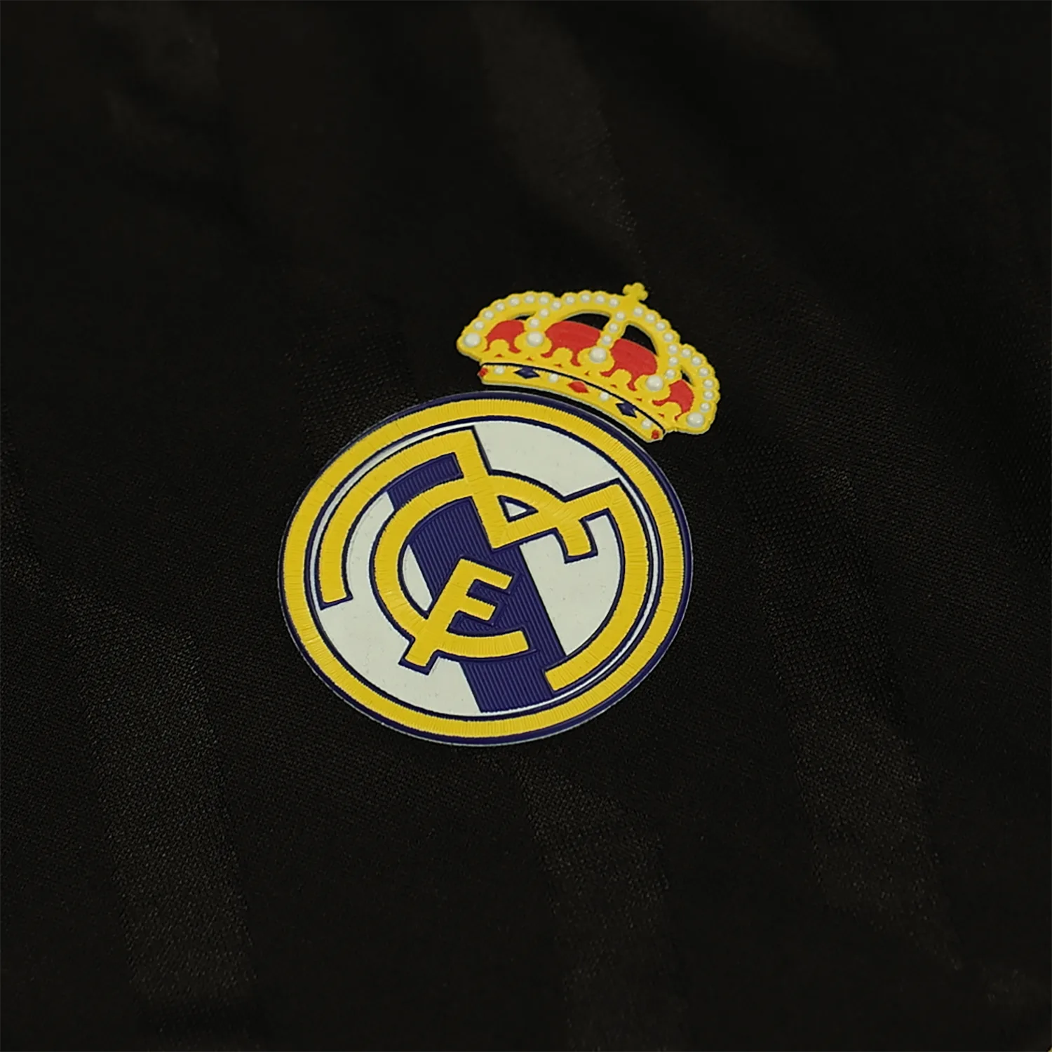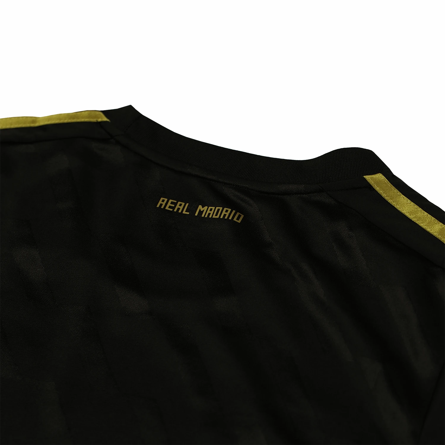 The Real Madrid 2011-12 away shirt is a striking piece of football apparel that reflects the club’s prestigious heritage and modern design sensibilities. Manufactured by Adidas, this shirt features a predominantly black color scheme with gold detailing, which was described as ‘gold fever’ by the brand, although it appears more bronze in certain lights. This design choice aligns with the trend of using darker colors for away kits, making it visually distinct and stylish for players and fans alike.