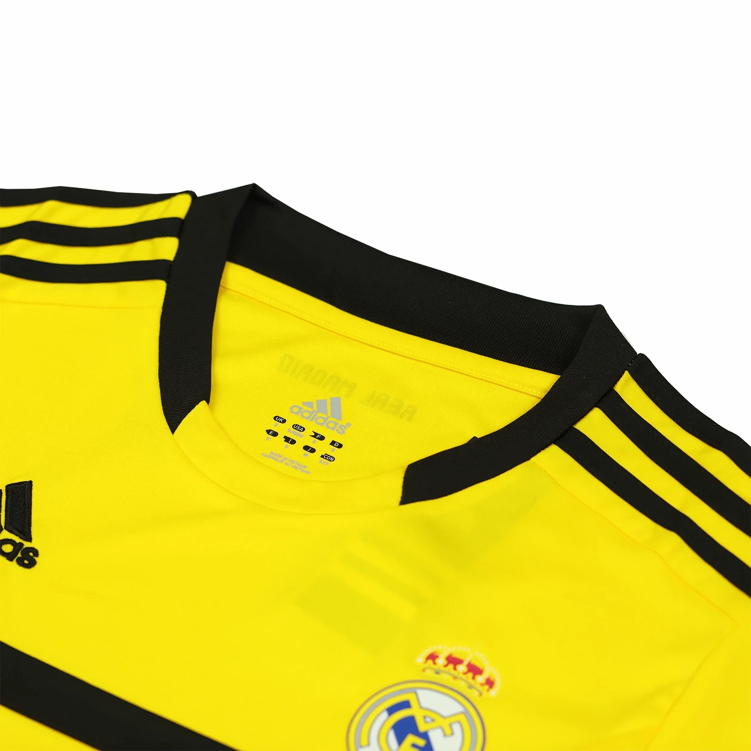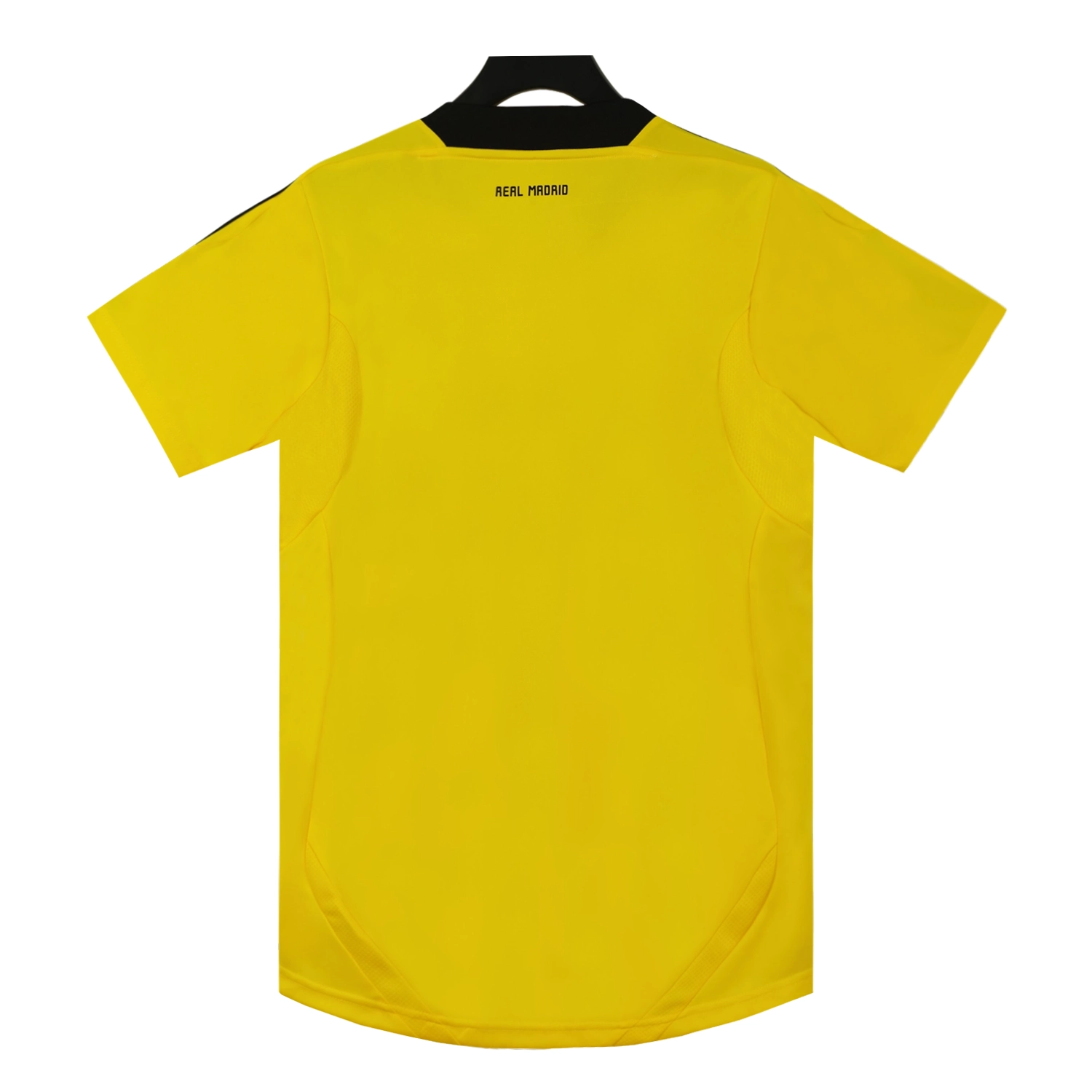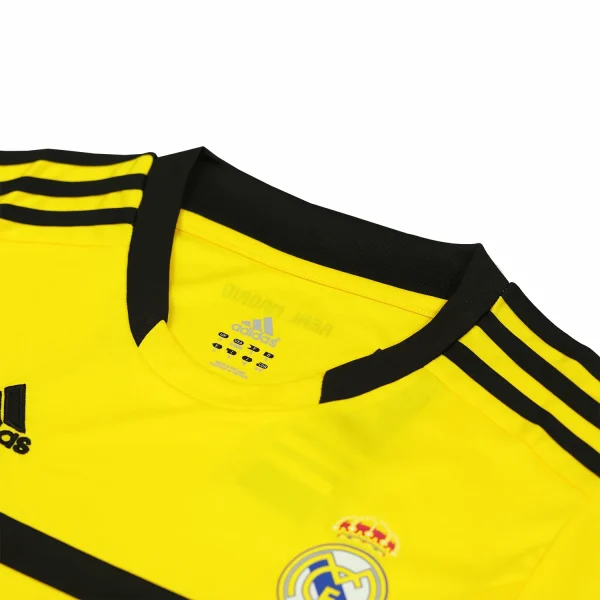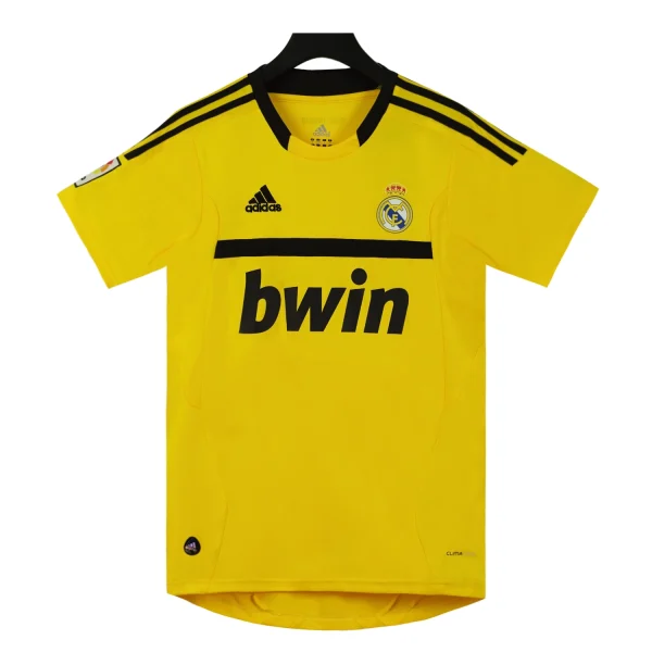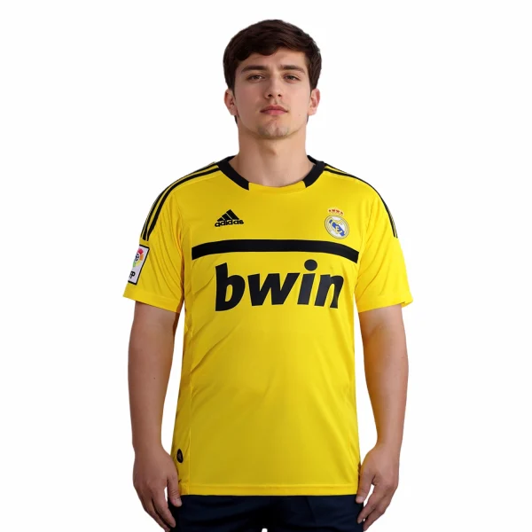 The Real Madrid 2011-12 goalkeeper home shirt, designed by Adidas, is notable for its distinctive yellow color. The shirt features the iconic Adidas three stripes and was worn during a successful season under José Mourinho, where Real Madrid claimed the La Liga title.