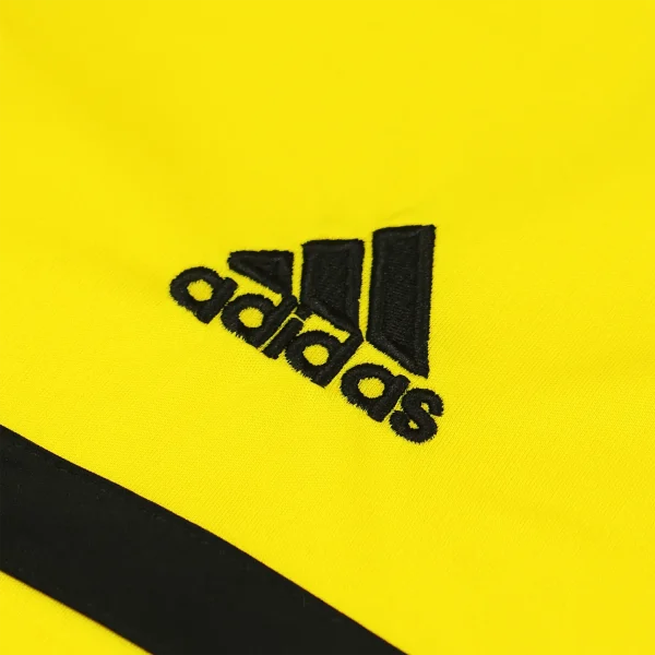 The Real Madrid 2011-12 goalkeeper home shirt, famously worn by Iker Casillas, is notable for its vibrant yellow color scheme, a traditional choice for goalkeepers to ensure high visibility on the pitch. This bright yellow is complemented by black accents, including the Adidas logo and the club crest, which are prominently displayed on the chest, adding a modern aesthetic to the kit.