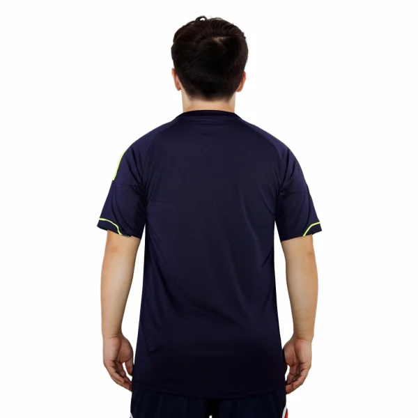 The away shirt features a striking navy blue color, complemented by thin stripes that run vertically across the fabric.