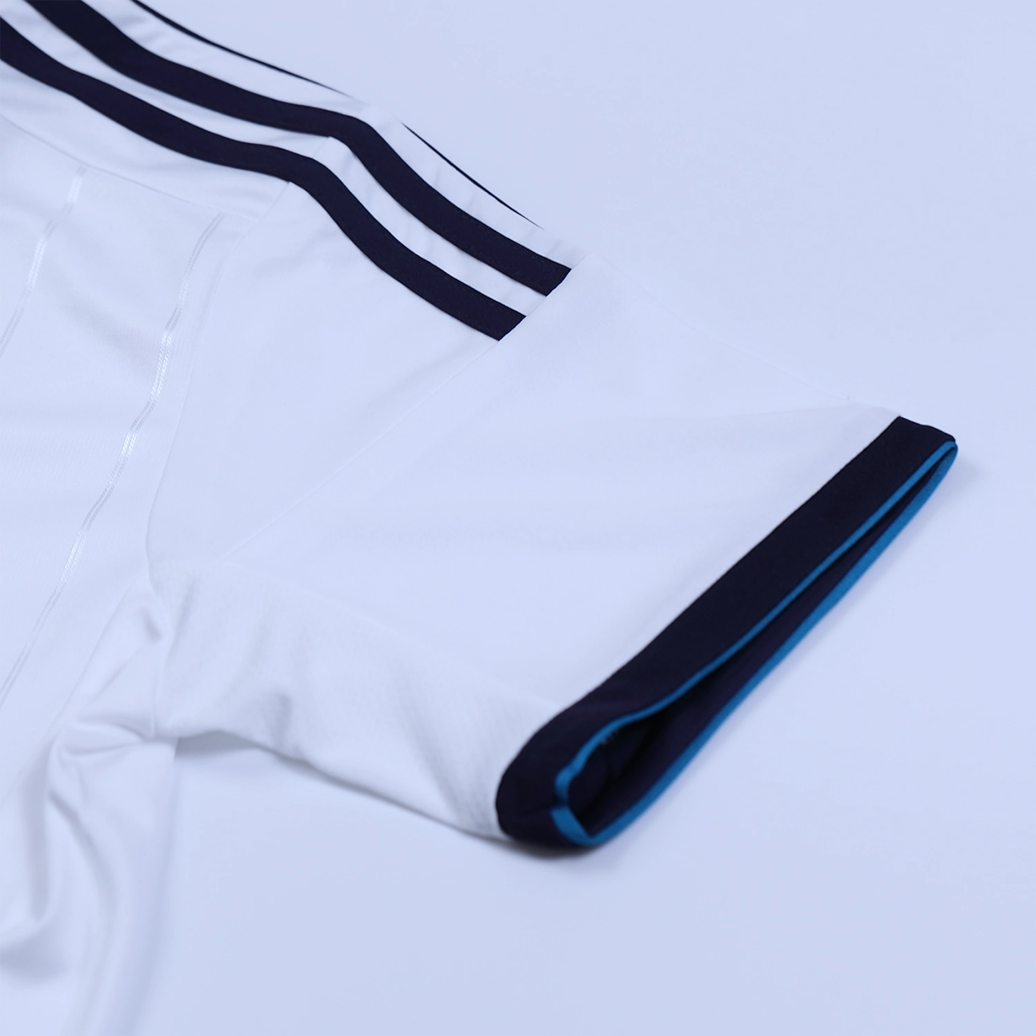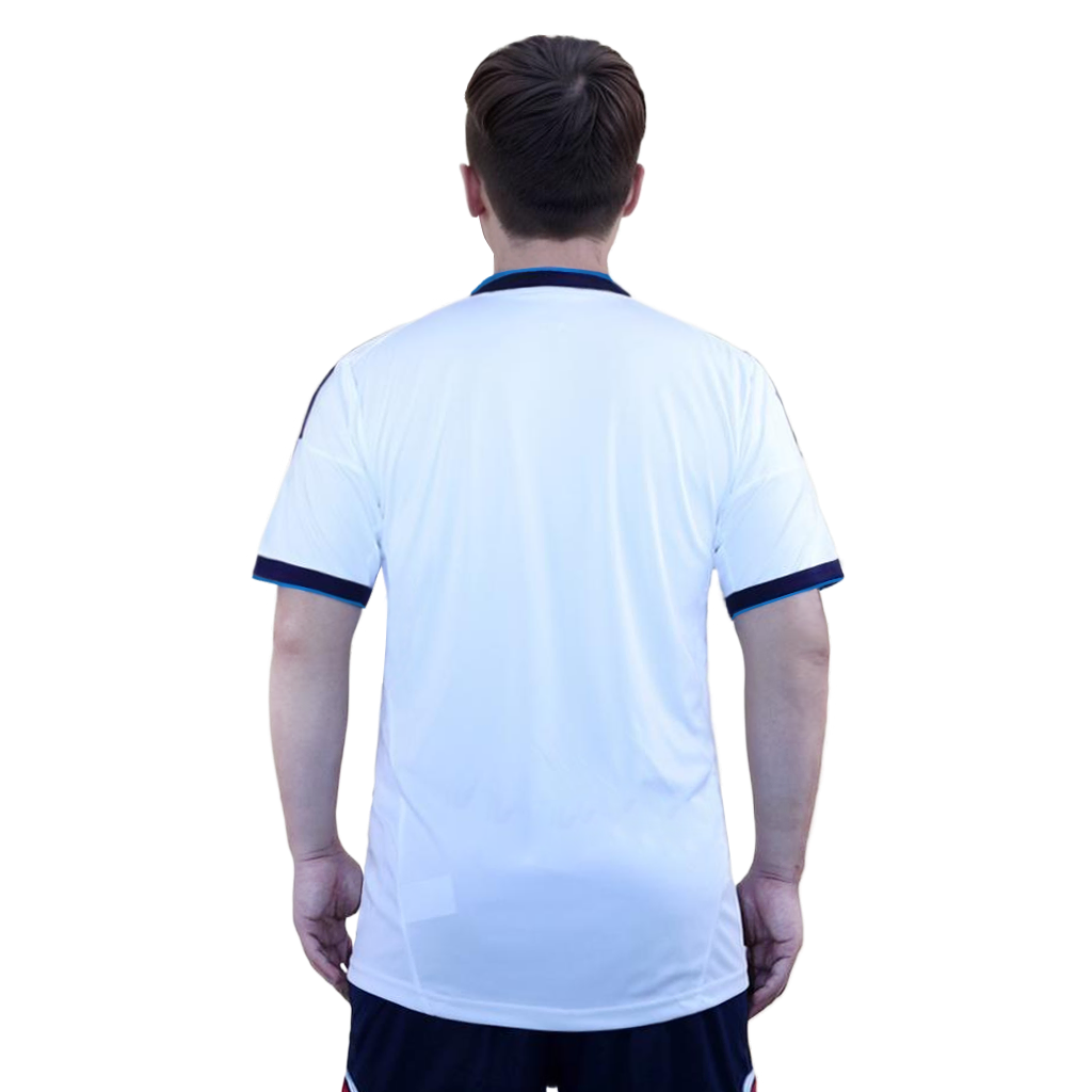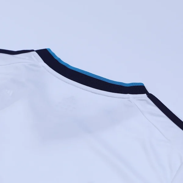 This classic base is complemented by dark blue and light blue accents, creating a striking contrast. The shirt features a dark blue V-neck collar and matching trim along the sleeves, enhancing its elegance and sporty look.
