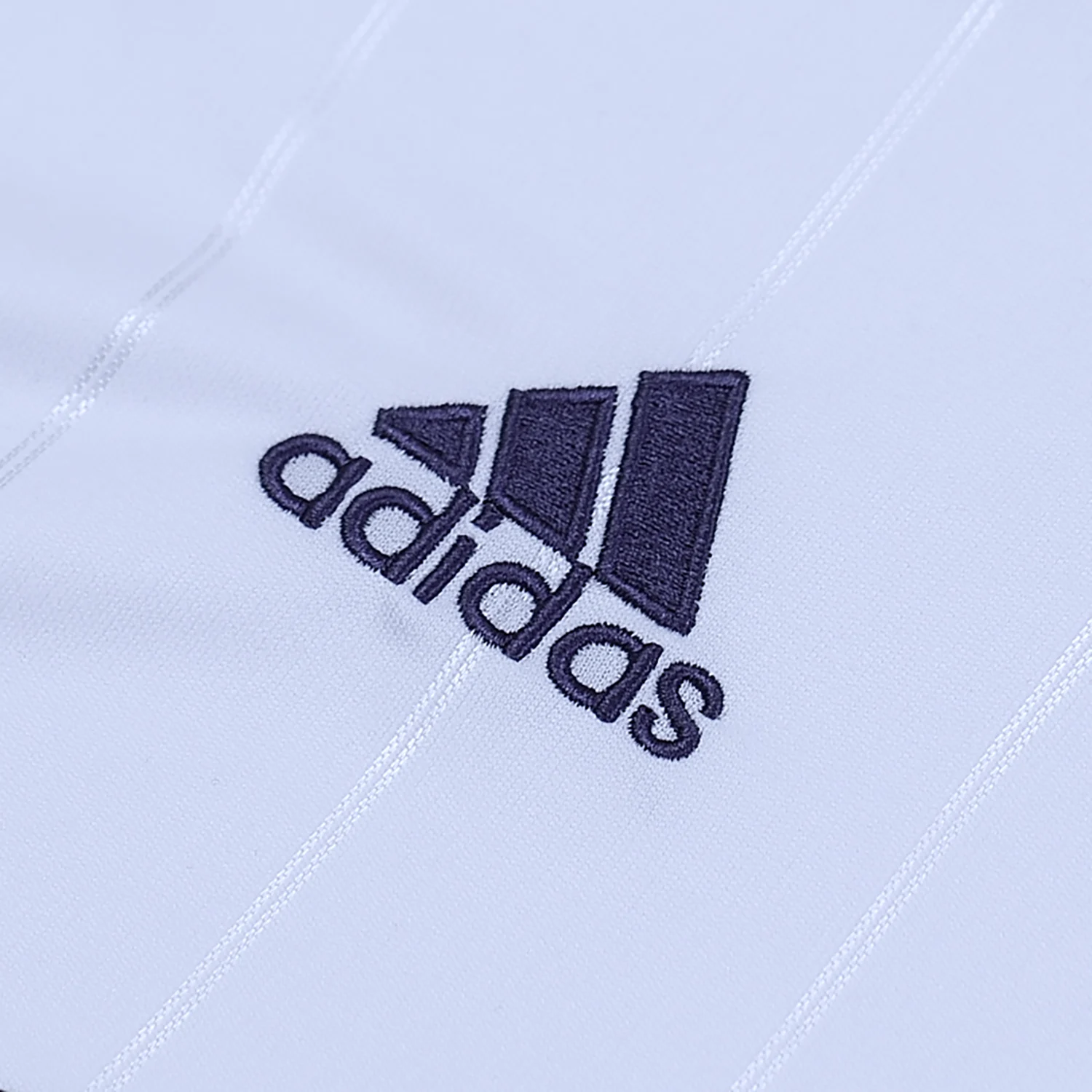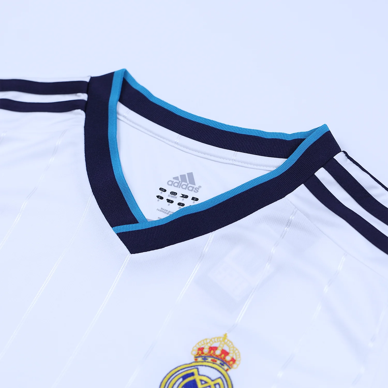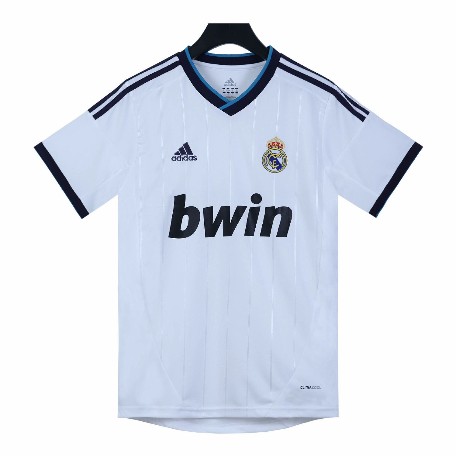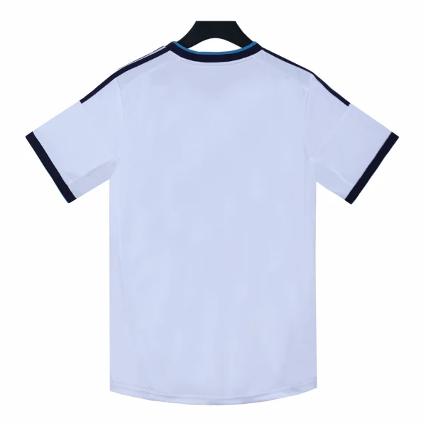 The Real Madrid 2012-13 home shirt is a classic piece of football memorabilia, featuring a predominantly white design with navy accents on the sleeves and v-neck collar.