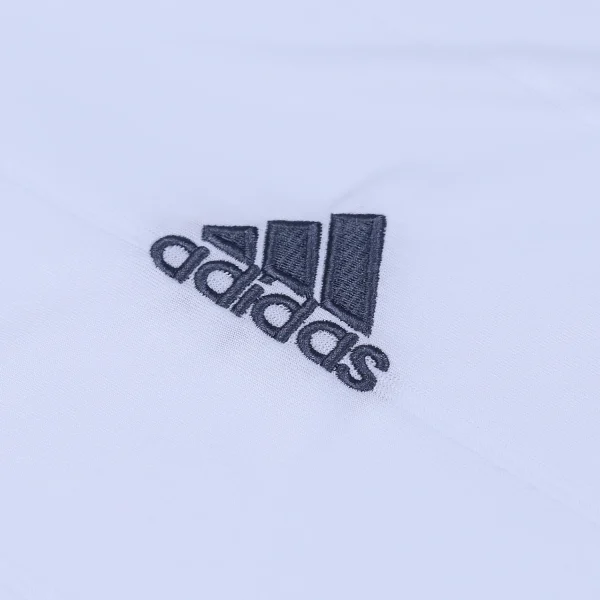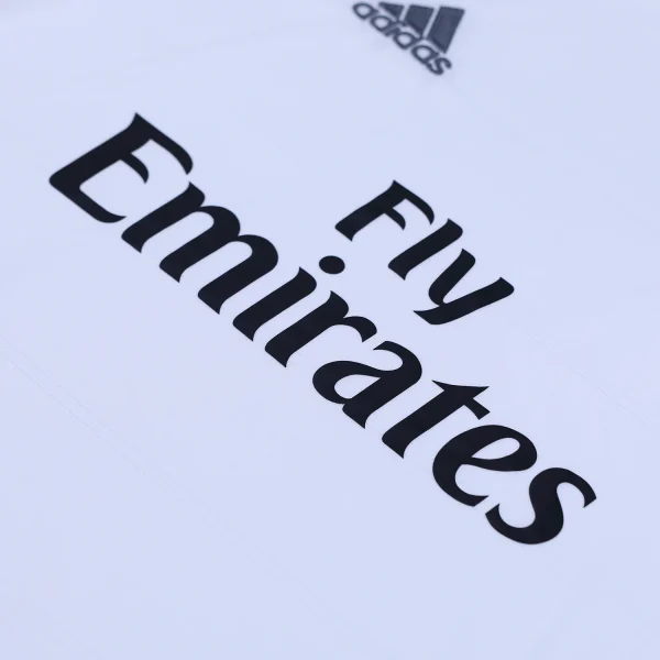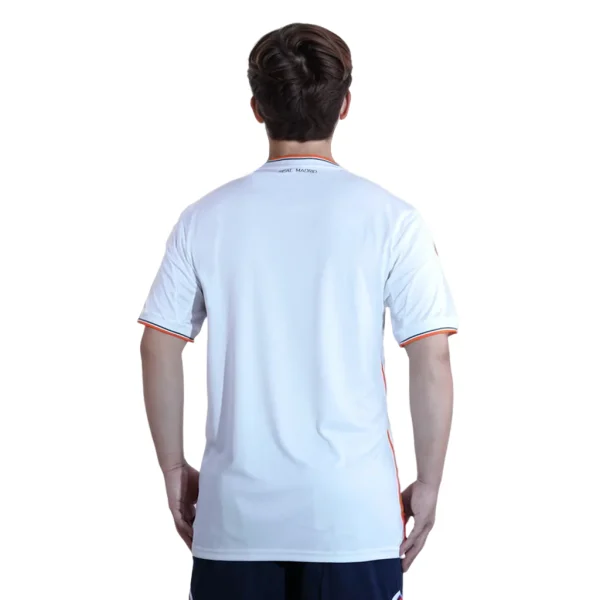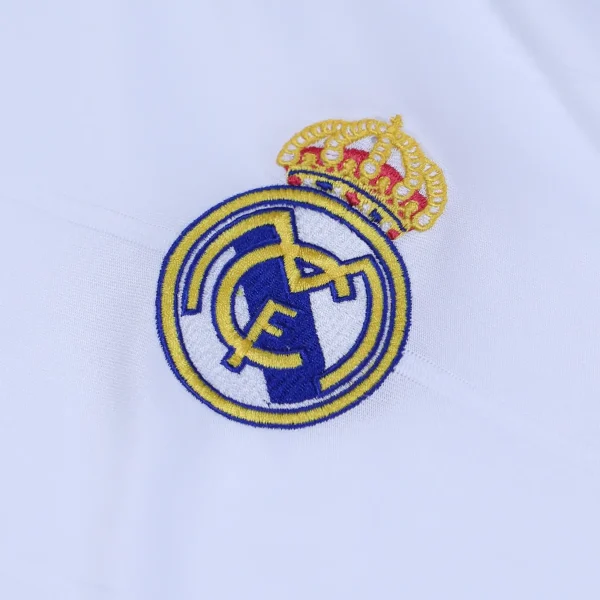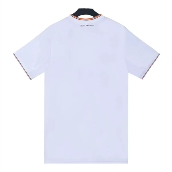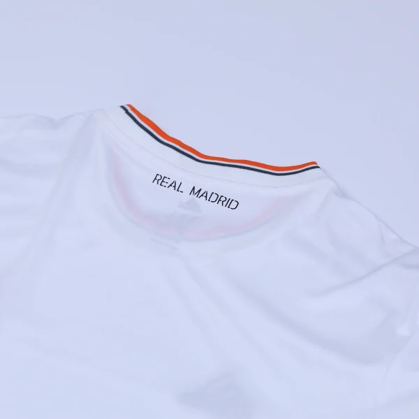 On the back of the shirt, just below the collar, the lettering “Real Madrid” is printed in high-density, signifying club pride and identity. This detail is designed to be visible from various angles, reinforcing the team’s branding.