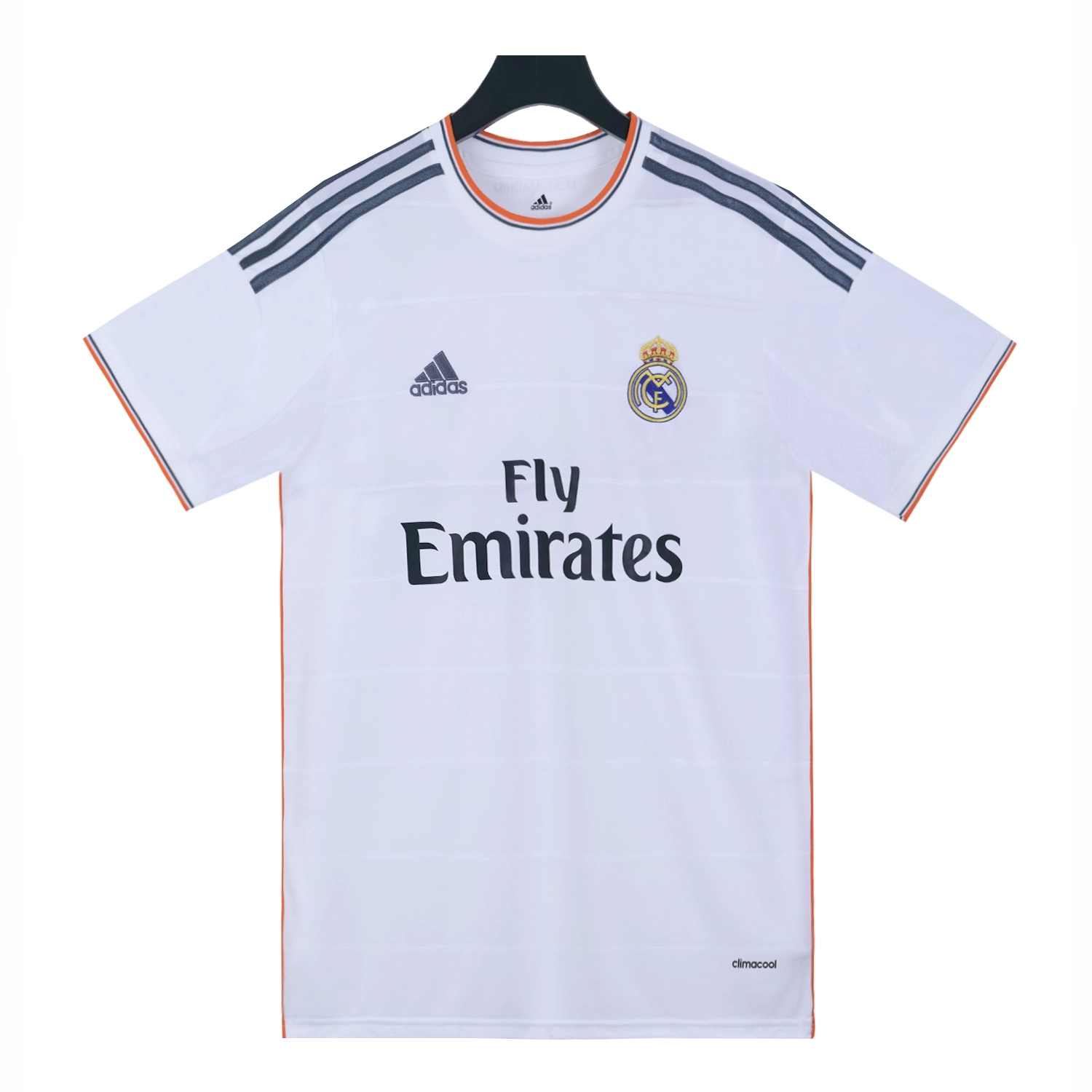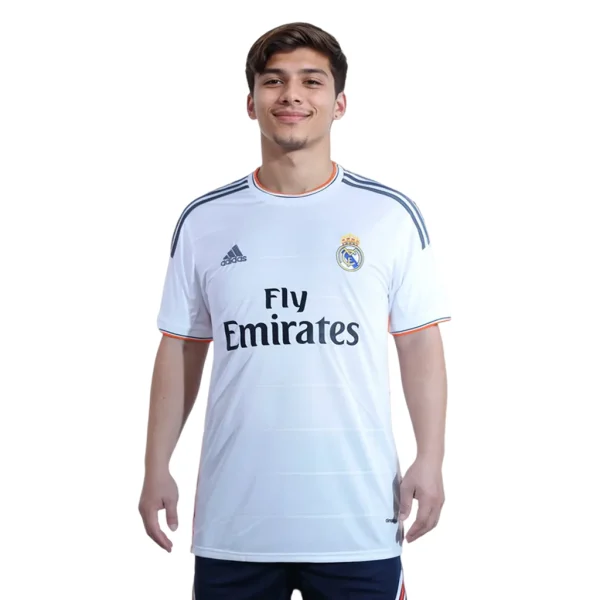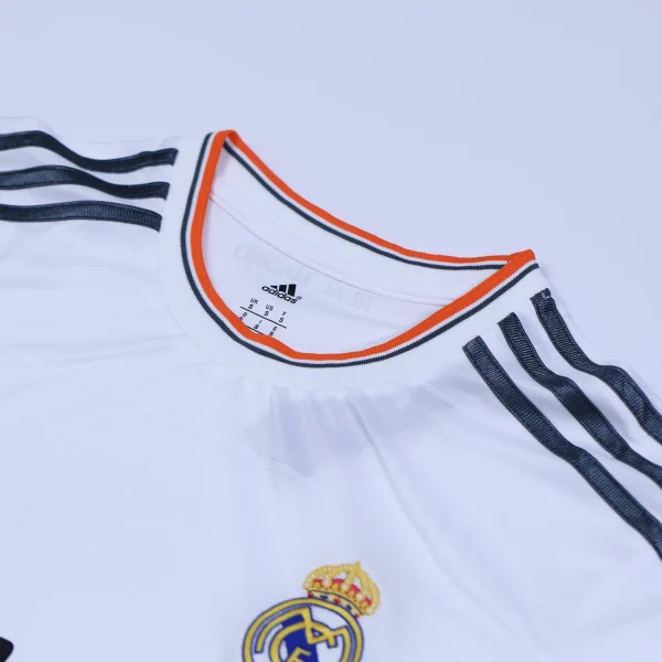 The Real Madrid 2013-14 home shirt is a distinctive piece in the club’s history, combining traditional elements with modern design features. The primary color of the shirt is the iconic white, synonymous with Real Madrid’s identity as “Los Blancos.” However, this season’s kit introduced vibrant orange and grey accents, marking a departure from previous designs.