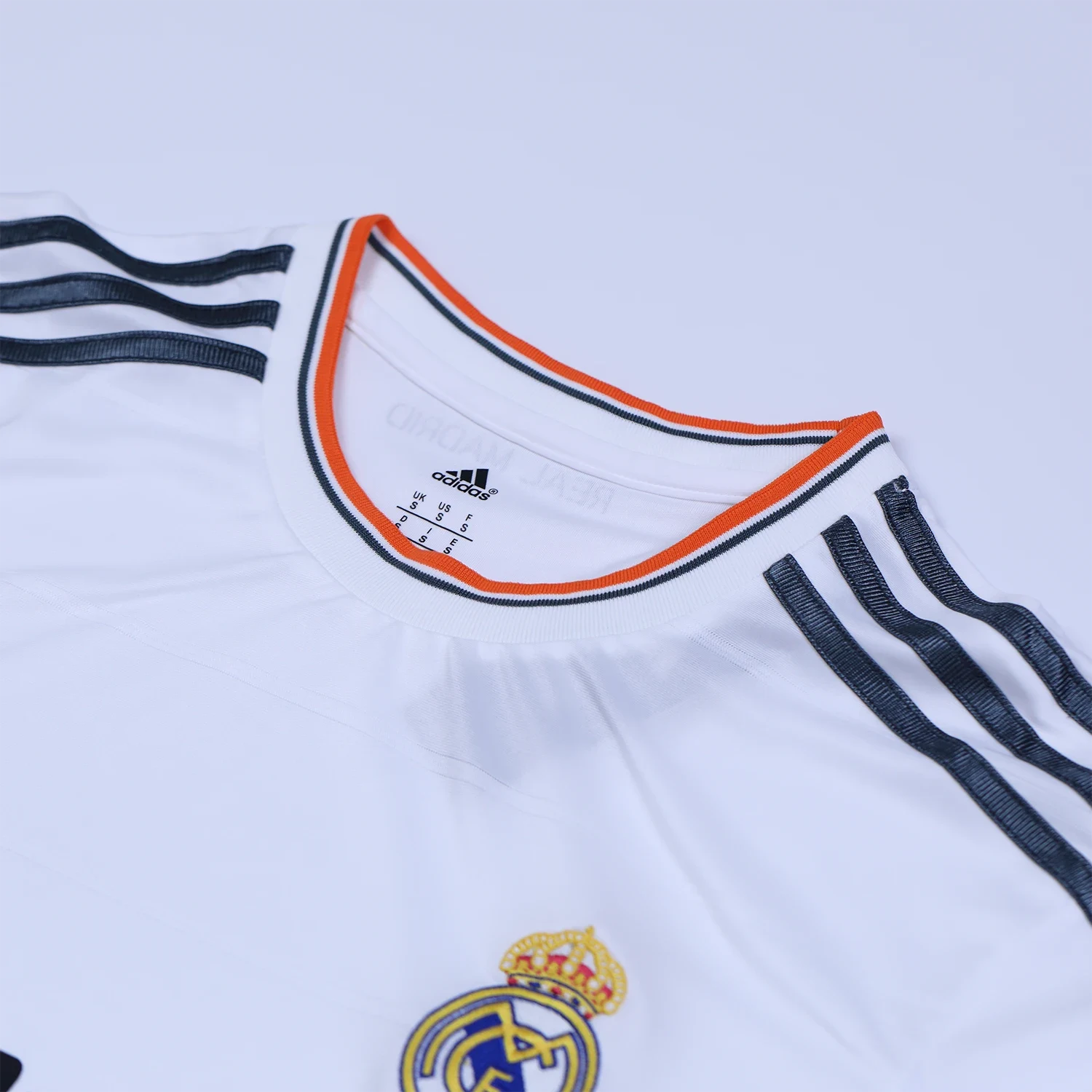 Overall, the Real Madrid 2013-14 home shirt is characterized by its classic white base enhanced with orange detailing and a unique horizontal block pattern. These elements combine to create a modern yet respectful homage to the club’s storied history.