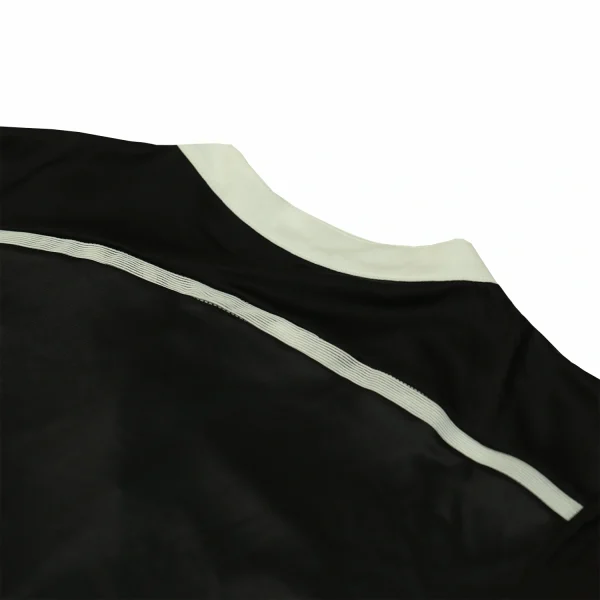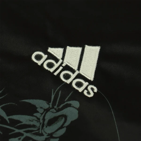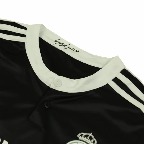 The shirt includes a distinctive mao-style collar, adding a touch of elegance and aligning with Yamamoto’s fashion-forward vision. Inside the collar, Yamamoto’s signature is inscribed, further emphasizing the designer’s influence on this piece. The club’s crest has been modified to fit the black-and-white theme, enhancing the overall visual coherence of the kit.