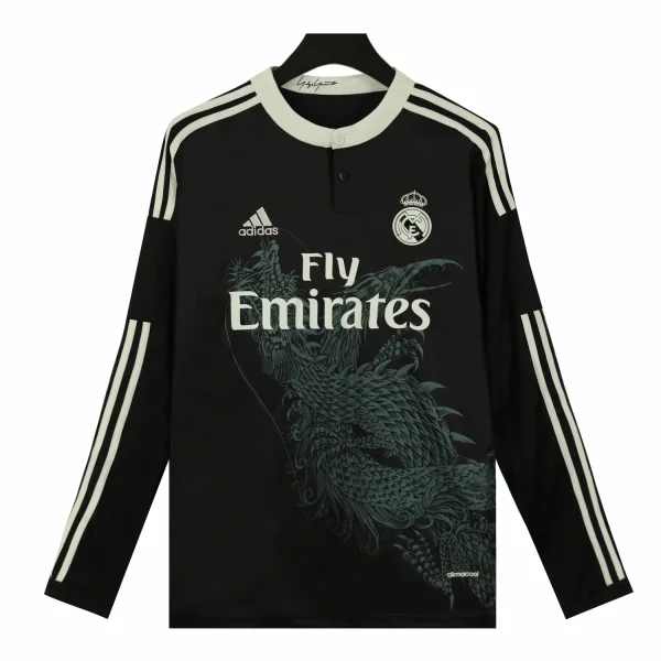 The Real Madrid 2014-15 third shirt, designed by the renowned Japanese fashion designer Yohji Yamamoto, is distinguished by its unique design and color scheme. The shirt is predominantly black, complemented by white details, creating a sleek and modern appearance. This color choice aligns with the club’s image of elegance and prestige, while also reflecting sophistication and power, as favored in Japanese culture.