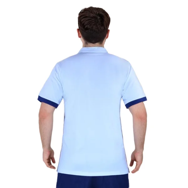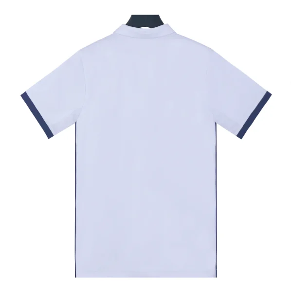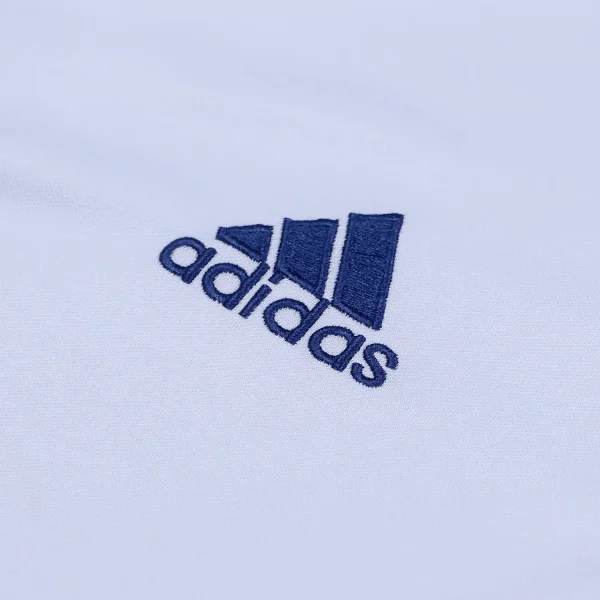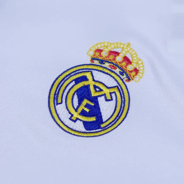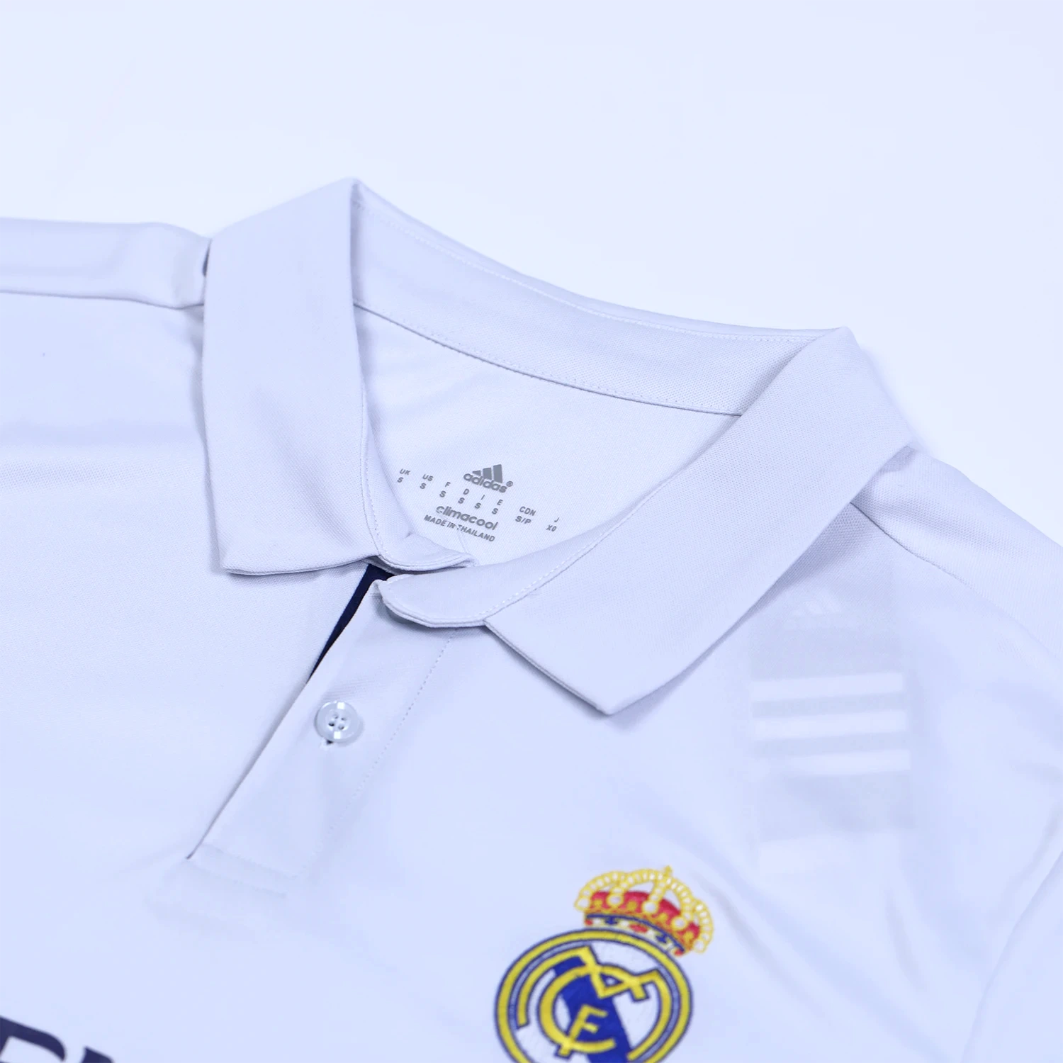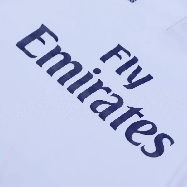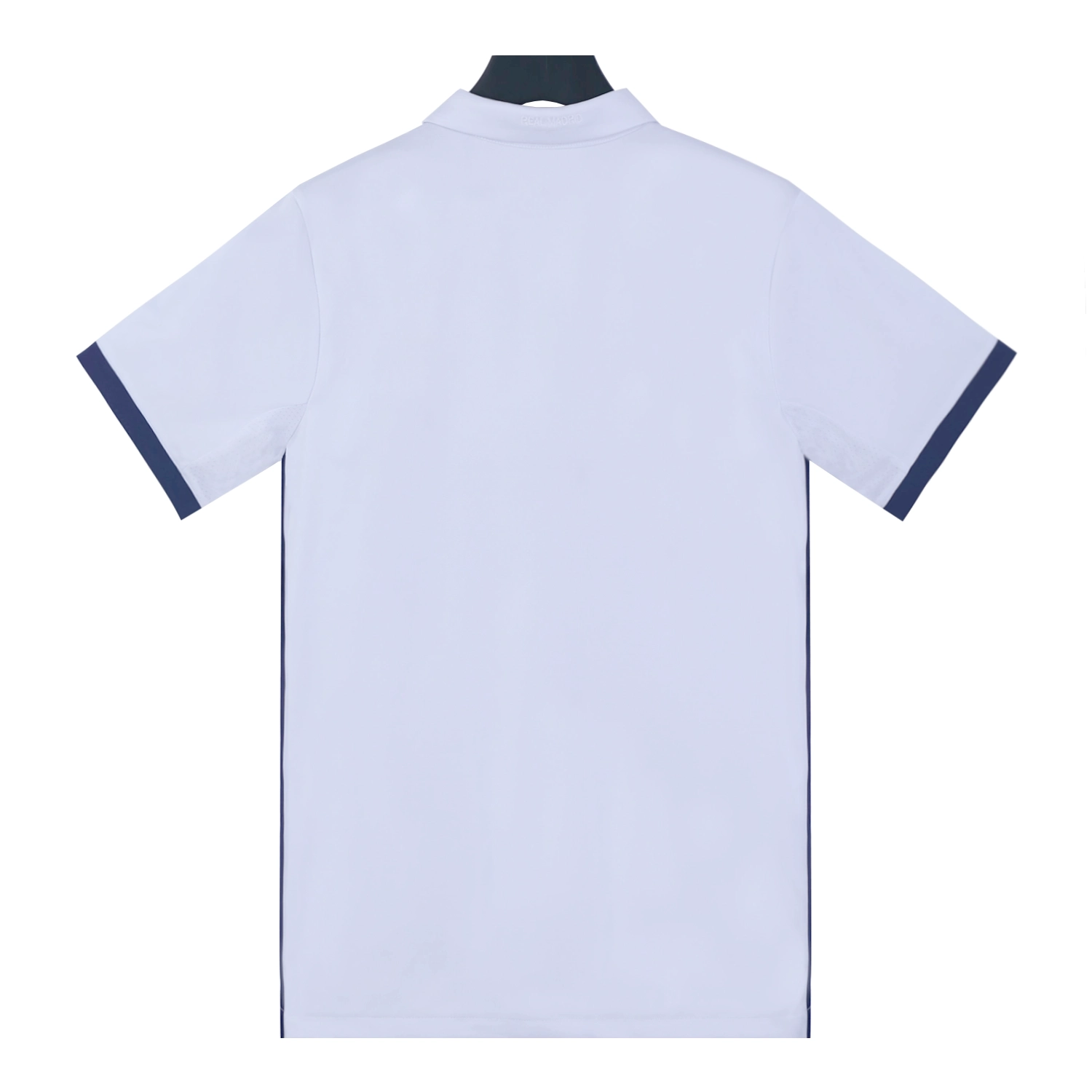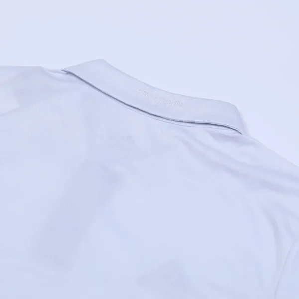 The shirt features a traditional polo collar, the back of the collar is embroidered with “REAL MADRID,” enhancing its classic appeal.
