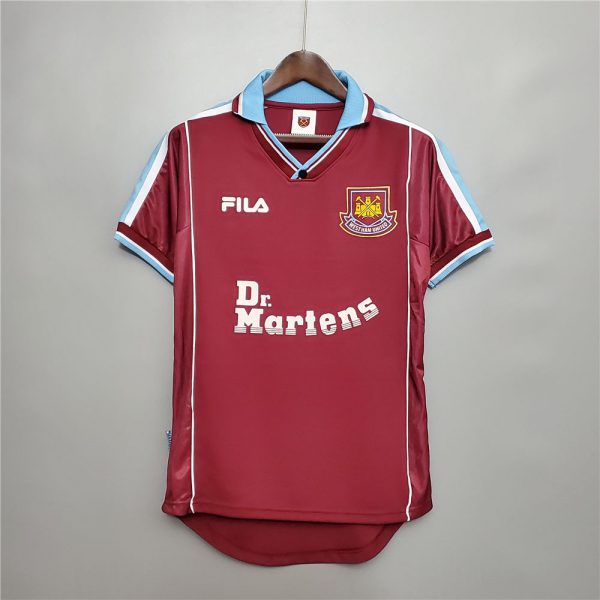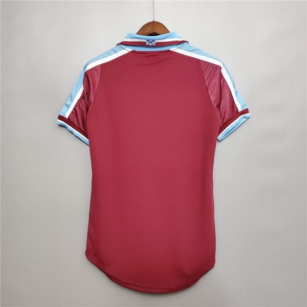 The West Ham United home shirt from the 1999-2001 seasons is a classic example of football apparel that reflects both the club’s identity and the fashion trends of the era. The shirt is primarily characterized by its traditional color scheme of claret and blue, which are emblematic of West Ham United. The main body of the shirt is claret, a deep red hue, complemented by sky blue sleeves.